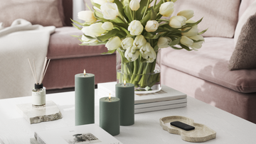Brug bloklys i små grupper med forskellige højder. Det giver dybde og et gennemført udtryk i indretningen.