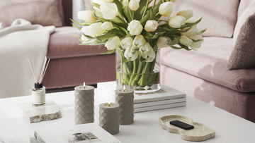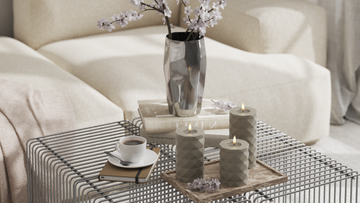 För ett lugnt helhetsintryck kan du samla ljusen på ett fat och variera höjderna samtidigt som du håller färgerna i samma palett.
